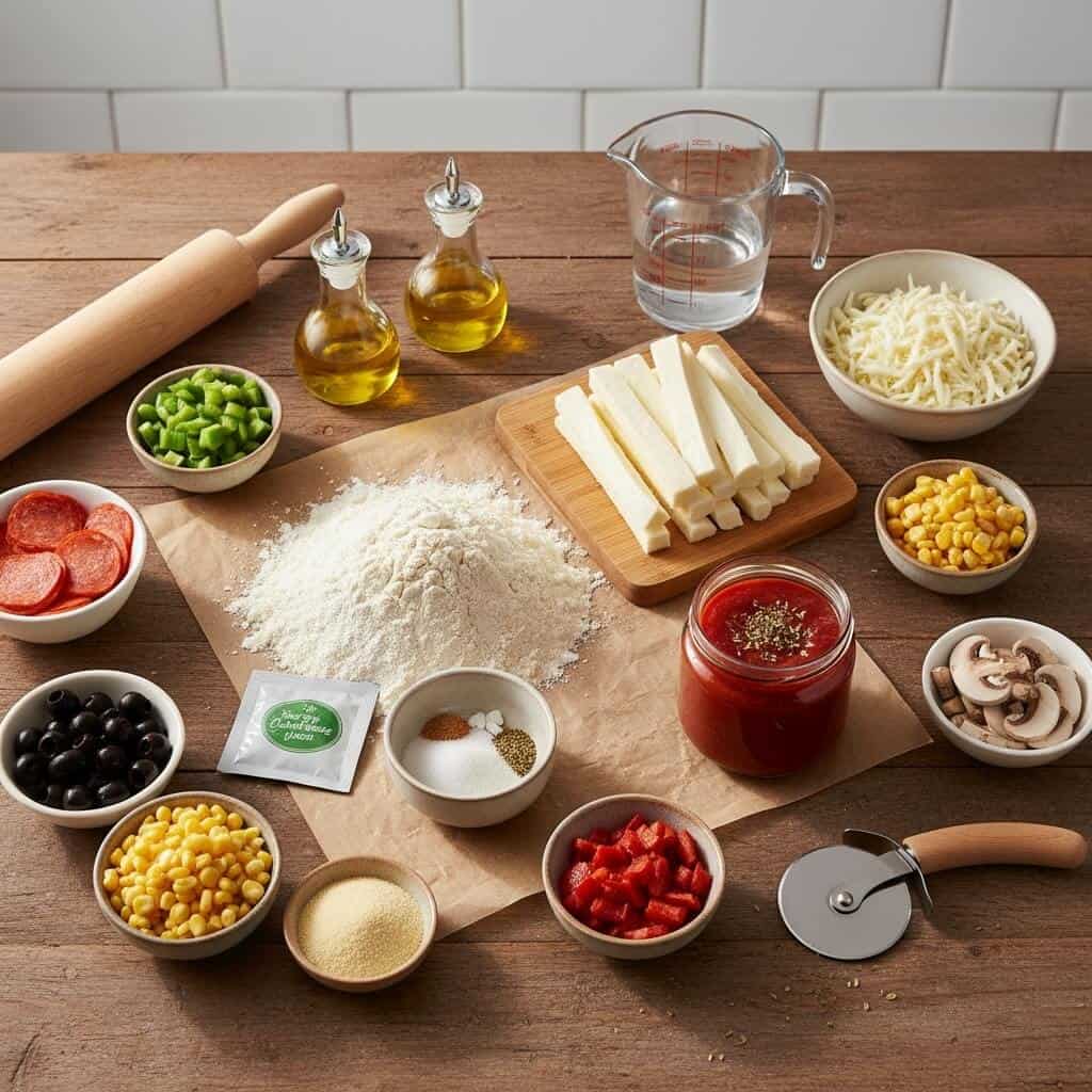 - Your choice of toppings (e.g., pepperoni slices, chopped bell peppers, mushrooms, sweetcorn, olives)