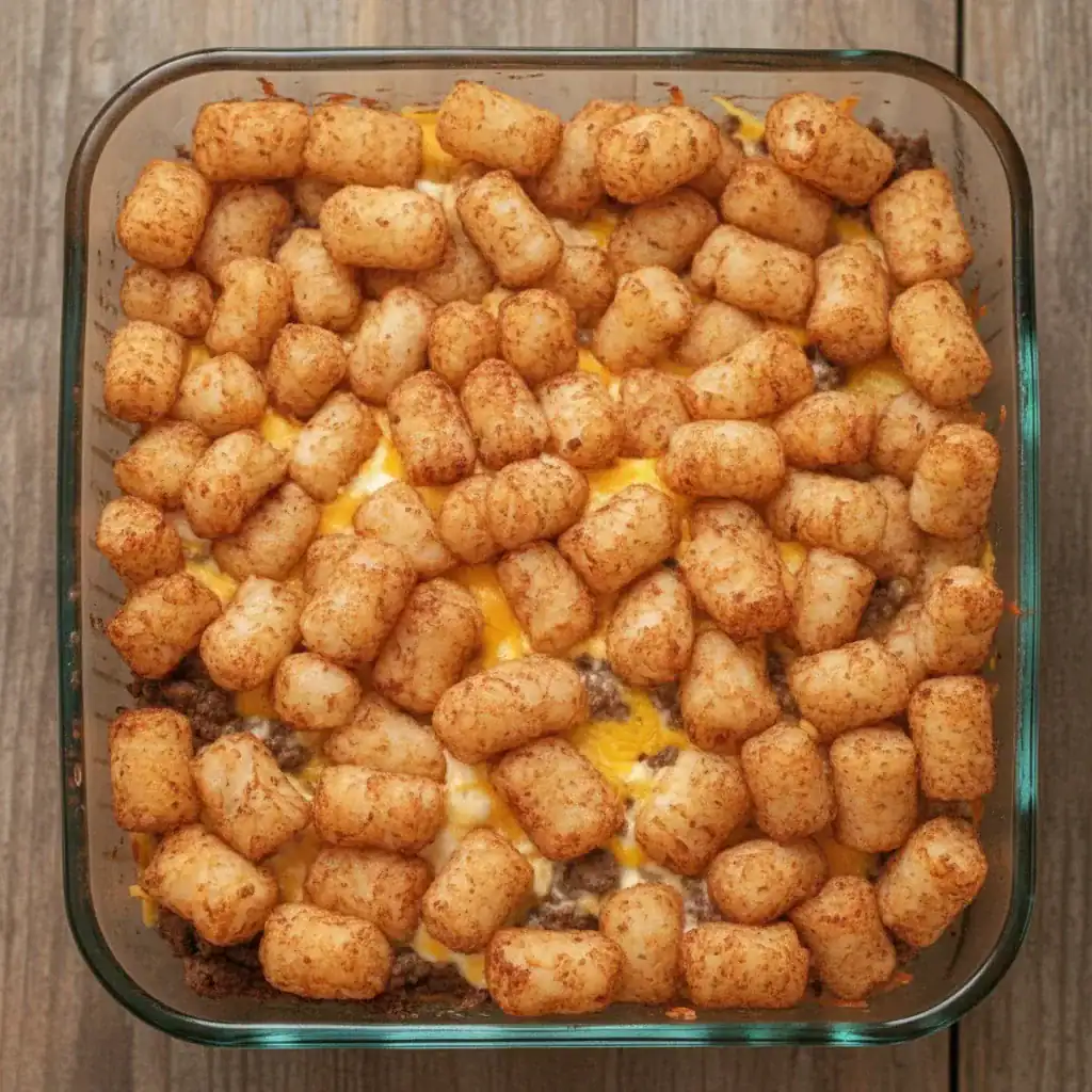 - Spread the beef mixture into a 9×13-inch baking dish. Arrange the frozen tater tots in a single layer on top.